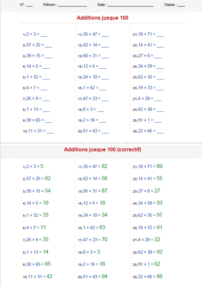 Différents types d'exercices : additions classiques, additions